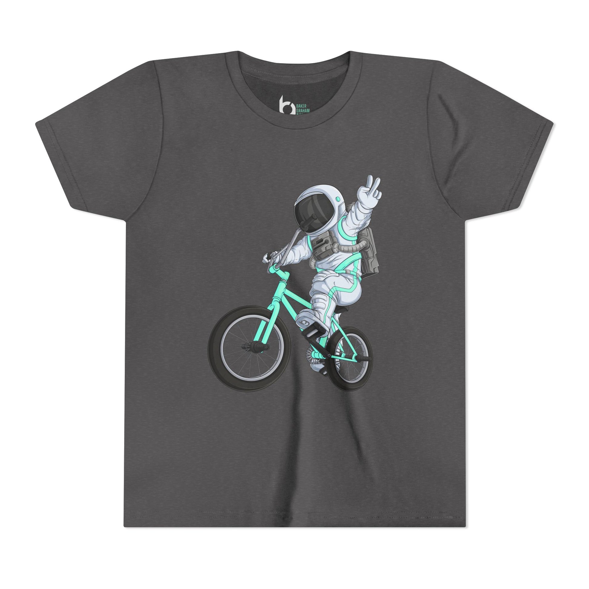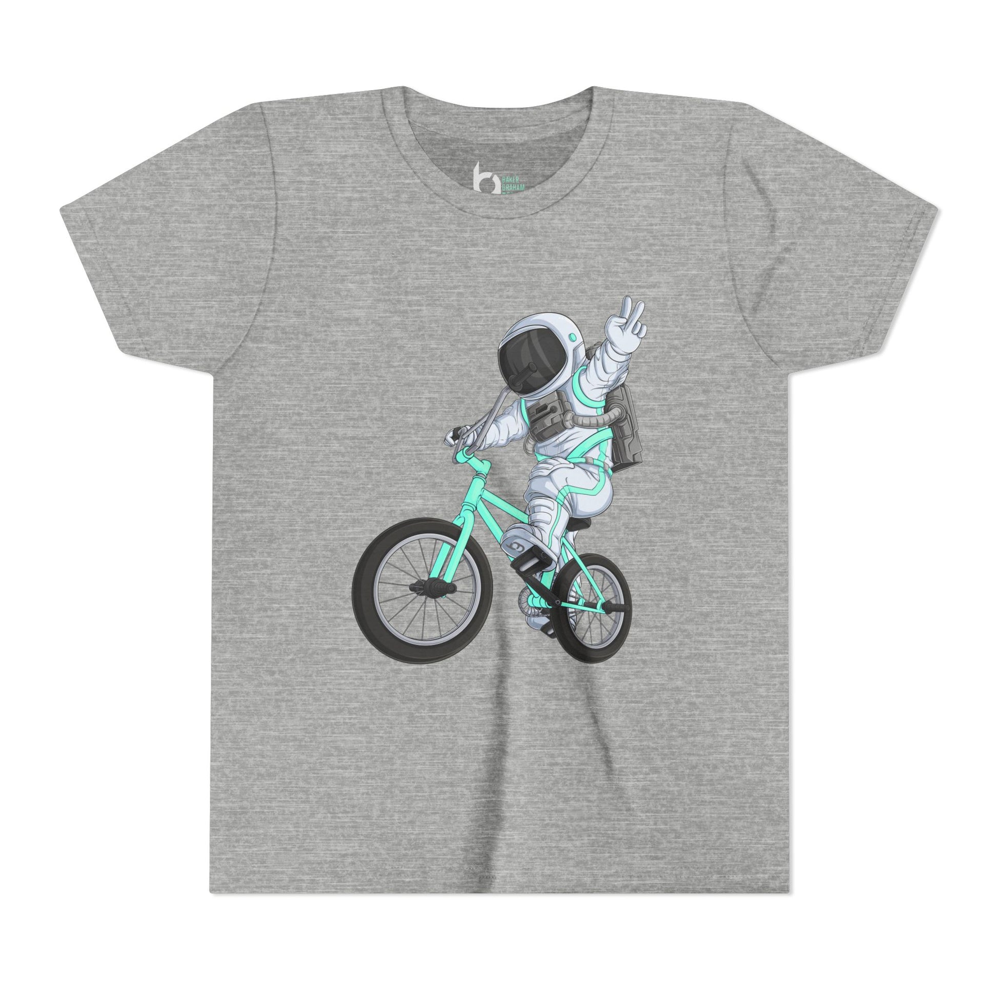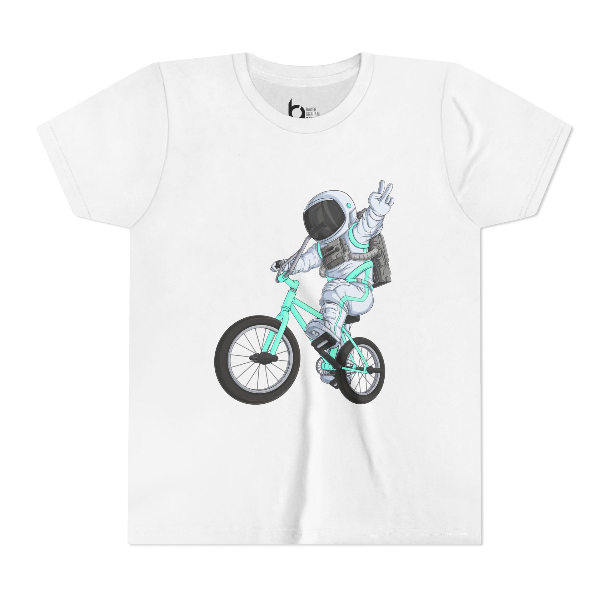 Kids will love this Astronaut riding a BMX bike graphic short-sleeve tee. This lightweight side-seamed shirt maximizes comfort all day long. The ring-spun cotton makes this kids' short-sleeved tee perfect for displaying custom artwork. Side seams keep the garment's shape. The shoulders have tape for longer fitting. The collar is extra elastic due to ribbed knitting.